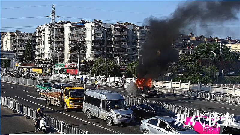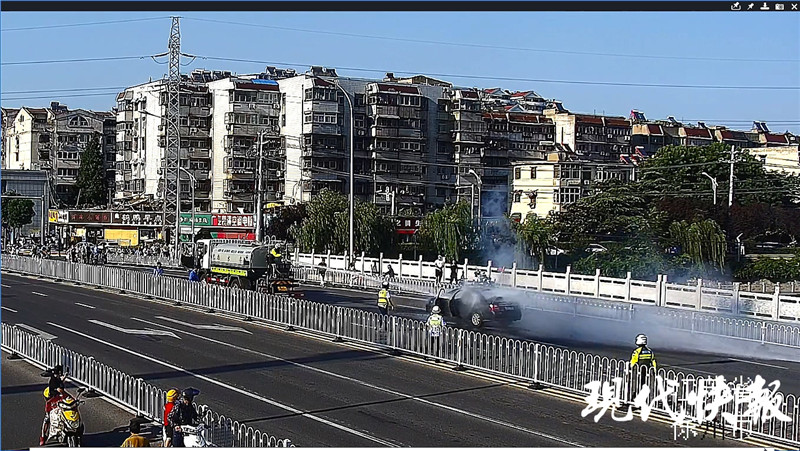 此時,明火已經在車頭開始燃燒。正在蘇堤北路巡邏的徐州交警泉山大隊四中隊輔警杜策發(fā)現了橋上的火情,立即通過對講機請求支援,并向附近的城管崗亭請求協(xié)助,與銅沛辦事處的城管隊員們一起拿著滅火器趕到車旁開始滅火。