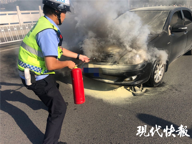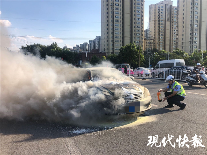 轎車行駛途中自燃 交警滅火時來了輛灑水車……