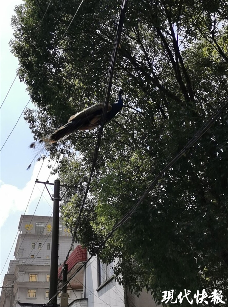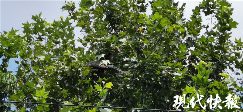 9月1日,常熟市公安局興福派出所接群眾報(bào)警稱,黃河路郵政小公園一棵梧桐樹上立著一只孔雀。接到報(bào)警后,派出所一面聯(lián)系常熟市消防大隊(duì)黃河路中隊(duì)尋求幫助,一面安排民警攜帶抓捕裝備前往現(xiàn)場(chǎng)?,F(xiàn)場(chǎng),許多群眾正在圍觀,民警在報(bào)警人的指引下見到了這只迷途的孔雀。只見它泰然自若立在離地約6米高的梧桐樹樹冠上,正悠閑地享受著傍晚的涼風(fēng)。