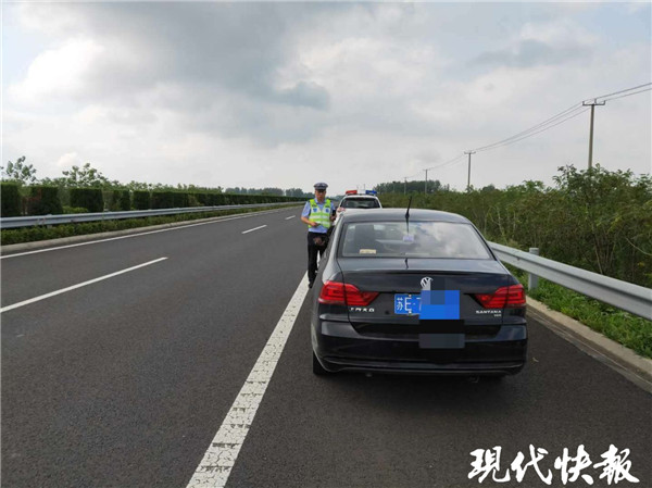 9月11日上午10點(diǎn)左右,鹽城高速五大隊(duì)民警正在G1516鹽洛高速巡邏時(shí),在99公里處發(fā)現(xiàn)一輛黑色轎車停在應(yīng)急車道。“沒開啟危險(xiǎn)報(bào)警閃光燈,無任何安全防護(hù)措施,當(dāng)時(shí)正值車流高峰期,非常危險(xiǎn)。”民警立即停車,并上前查看情況。