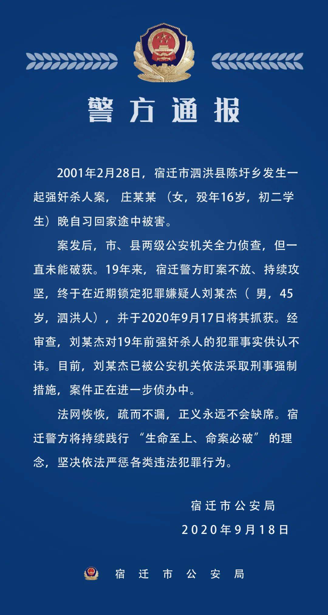 受害人遇害時(shí)年僅16歲。據(jù)通報(bào)顯示,2001年2月8日,宿遷市泗洪縣陳圩鄉(xiāng)一個(gè)16歲的初二女生莊某某在晚自習(xí)回家途中,遭到強(qiáng)奸,并遇害。案發(fā)后,市縣兩級(jí)公安機(jī)關(guān)一直在全力偵查,最終在近日鎖定了一名男子劉某杰(45歲,泗洪人)警方于9月17日將劉某杰抓獲后,他對(duì)19年前強(qiáng)奸殺人的犯罪事實(shí)供認(rèn)不諱。