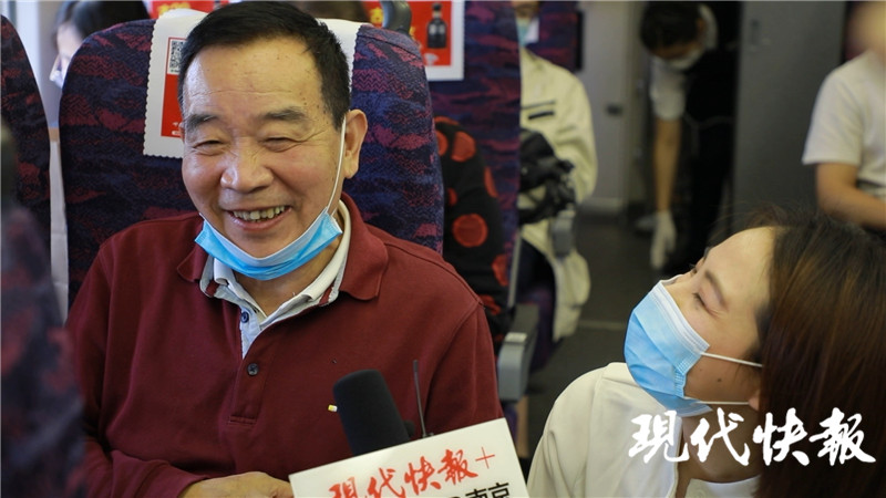 “之前我每年都回老家好多趟,今年因為疫情,還是第一次和老家的親人團(tuán)圓。”見到記者正在直播,77歲的錢瑞興主動舉手要求參與。他剛在常州老家和親人們團(tuán)聚完,正返程回上海。他說,本來春節(jié)就打算回去,但因為疫情原因沒能成行,趁著中秋國慶長假,終于踏上了回鄉(xiāng)的列車。他身旁坐著的是他的二哥,他們一起去常州看望大哥。“利用這個假期和親人團(tuán)圓是多么高興的事情啊!我們在家團(tuán)聚以吃飯為主,又到周邊看看大好的景色發(fā)展,很滿足,很滿足。”說著錢瑞興哈哈大笑起來。