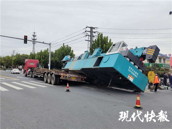 民警迅速趕到現(xiàn)場,只見一輛半掛車上裝載的重型打樁機掉落在路口東北角,占據(jù)了右側(cè)兩股車道,民警急忙疏導(dǎo)過往車輛繞行,以免引發(fā)二次事故。