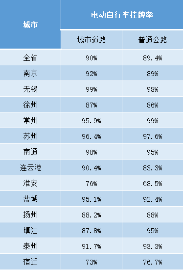 全省城市路口電動自行車掛牌率平均值為90%,其中無錫最高為99%;全省國省道普通公路電動自行車掛牌率平均值為89.4%,其中常州最高為99%。