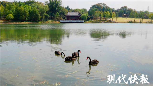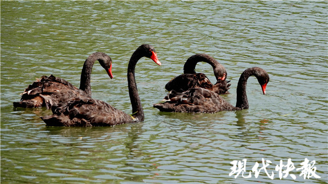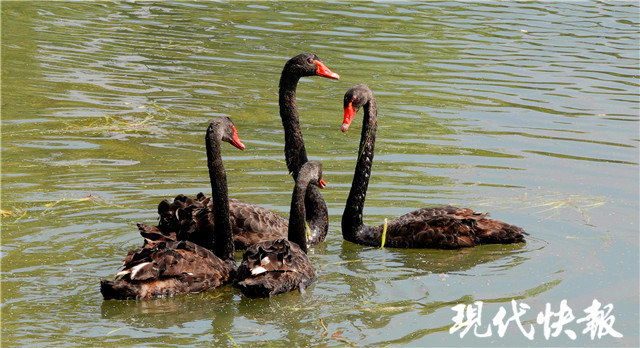 10月11日,現(xiàn)代快報記者來到燕雀湖邊,看到4只黑天鵝在這里“定居”。它們在波光粼粼的湖面上游來游去,覓食嬉戲,不時發(fā)出一聲聲鳴叫,仿佛在與游人“打招呼”,逗得孩子們合不攏嘴。
