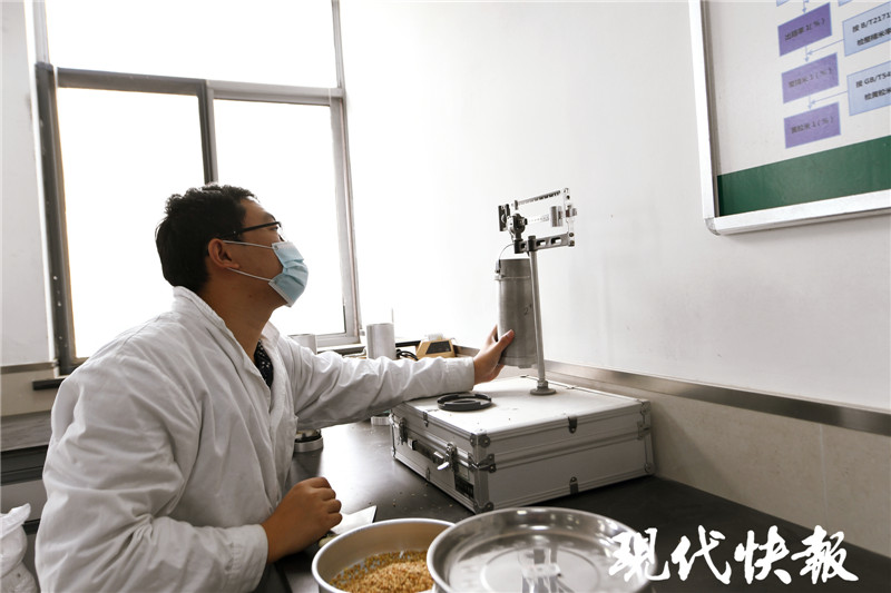 剛進入糧庫區(qū)域,現(xiàn)代快報記者看到幾輛大貨車正在卸糧食,稻谷經(jīng)過傳送帶和兩道過篩的工序,然后運送到最近的一間糧庫內(nèi)。工作人員介紹,正在卸貨的大貨車裝載了19噸稻谷,都是來自淮安運過來的秋糧。卸貨過程中,有稻谷散落在地上,工人會及時清掃然后再次過篩,保證送來的糧食都顆粒歸倉。