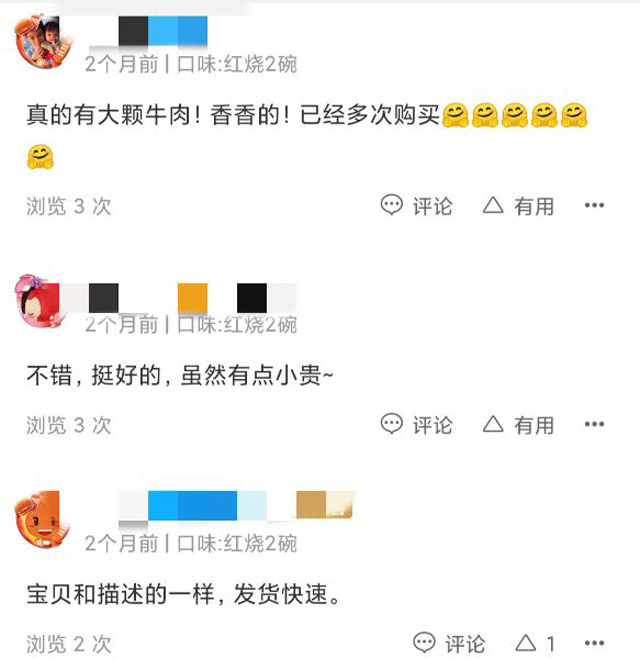 消費者是怎么評價的呢?“很好吃的方便面,真的有大塊肉在里面。”“好吃,連湯都喝完了,值這個價格。”不過也有人給差評,“太貴,沒吃出‘富貴’的氣質(zhì)。”“真的很一般,感覺還不如普通方便面。”根據(jù)評價分類,認(rèn)為性價比高的有236條評價,性價比一般的有269條。