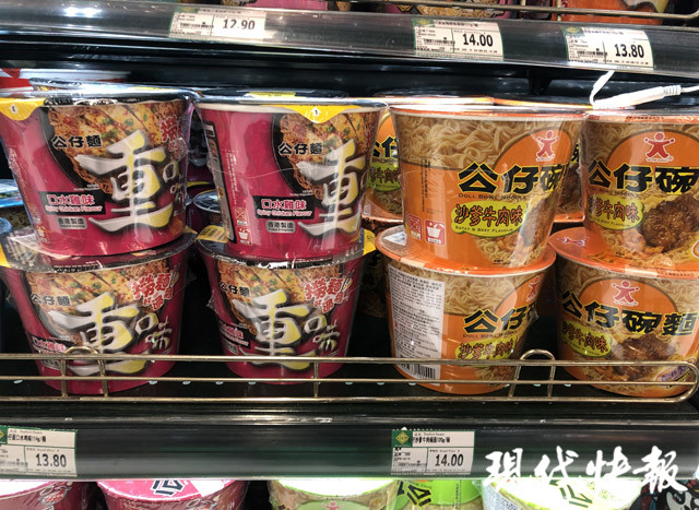 在新街口另外一家大型綜合超市,貨架上主要是傳統(tǒng)方便面,單價多在5元左右。其中只有兩款方便面價格較貴,有一款是康師傅的,一盒20元,重量246g;另一款統(tǒng)一方便面,重量180g,價格為18.9元。這兩款都是油炸方便面,大肉塊、高湯包是宣傳的重點。超市導(dǎo)購員告訴現(xiàn)代快報記者,由于價格比較高,這兩款方便面銷量一般。