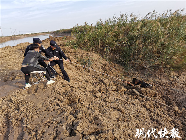 “救命,趕緊救救我!”民警尚未到達(dá)現(xiàn)場,便聽見泥潭中傳來鄂某呼救的聲音。在丁某的指引下,民警來到了事發(fā)地射陽港經(jīng)濟(jì)開發(fā)區(qū)金海島大橋東北灘涂附近,看見一名男子陷在淤泥中,只剩下上半身露在外面,整個(gè)人無法動(dòng)彈。