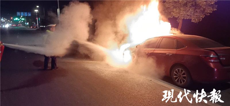 11月9日,南京市公安局江寧分局交警大隊湖熟中隊接到群眾報警,在湯銅路湖熟段有一輛轎車起火了。接到警情后,中隊立即組織警力前往現(xiàn)場進行處置。到達現(xiàn)場時,轎車的發(fā)動機位置已被火焰覆蓋,出警人員立即取出滅火器進行滅火,但由于火勢較大,滅火器已無法撲滅,只能等待消防到達現(xiàn)場。