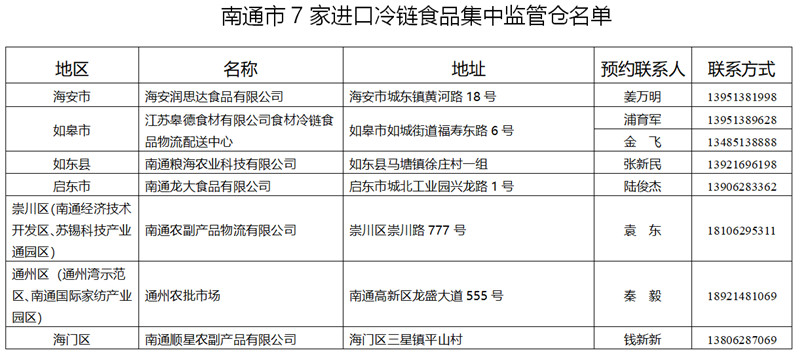一、從2020年11月23日起,南通海安市、如皋市、如東縣、啟東市、崇川區(qū)、通州區(qū)、海門區(qū)各設(shè)立1個進口冷鏈?zhǔn)称芳斜O(jiān)管倉(以下簡稱“集中監(jiān)管倉”),南通經(jīng)濟技術(shù)開發(fā)區(qū)、蘇錫通科技產(chǎn)業(yè)園區(qū)與崇川區(qū)共用集中監(jiān)管倉,通州灣示范區(qū)、南通國際家紡產(chǎn)業(yè)園區(qū)與通州區(qū)共用集中監(jiān)管倉。集中監(jiān)管倉設(shè)置和運行根據(jù)實際需要,全市統(tǒng)籌,動態(tài)調(diào)整。