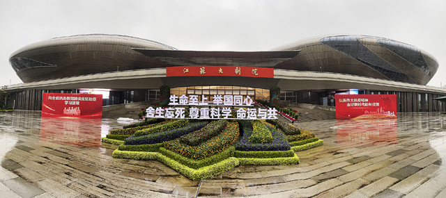在江蘇大劇院廣場(chǎng)前,生機(jī)勃勃的花型綠雕,一朵朵小花簇?fù)碇?,開得格外鮮艷。綠雕前面整齊排列著20個(gè)大字:生命至上 舉國同心 舍生忘死 尊重科學(xué) 命運(yùn)與共,烘托出會(huì)議的莊重和對(duì)英雄們崇高的敬意,讓大家銘記偉大的抗疫精神。