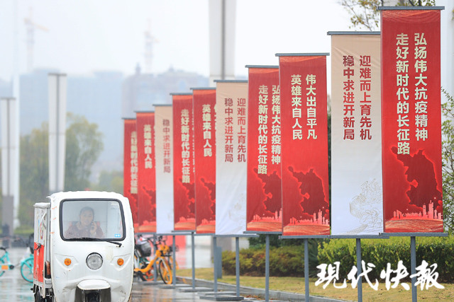 11月25日,現(xiàn)代快報(bào)記者從鐘山賓館經(jīng)中山東路、龍?bào)粗新贰?yīng)天大街高架、江東中路、夢(mèng)都大街,一路都可以看到紅色或是白色的道旗,格外醒目。道旗上的宣傳標(biāo)語令人振奮、超級(jí)暖心。26日,這些道旗將一路指引和歡迎抗疫英雄,到達(dá)江蘇大劇院參加表彰大會(huì)。