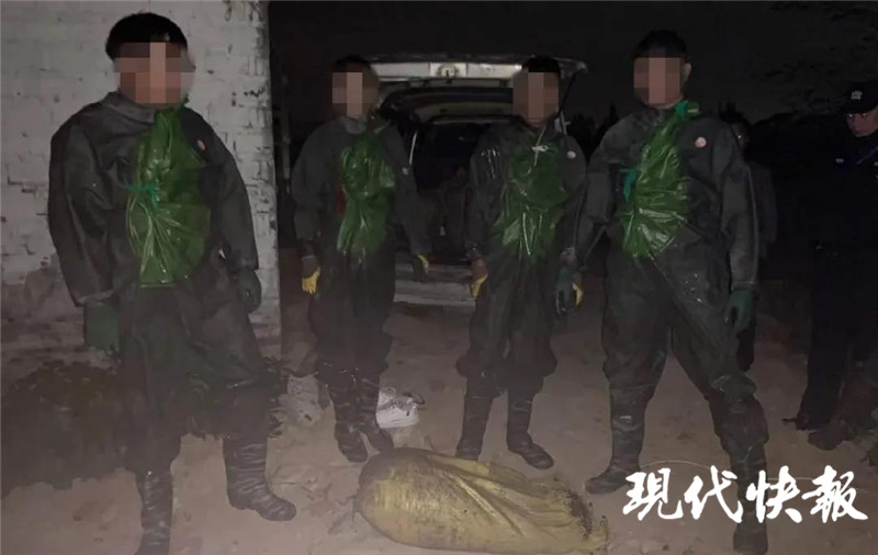 此時(shí)正值凌晨,一位看管魚(yú)塘的老人告訴民警,在前面的魚(yú)塘有四個(gè)人在偷螺螄。民警悄悄觀察后發(fā)現(xiàn),四個(gè)穿著熒光綠水產(chǎn)捕撈服的人,張開(kāi)半米左右的三角形網(wǎng),正在魚(yú)塘里偷螺螄。確認(rèn)情況后,民警迅速出動(dòng),一舉將四人抓獲。