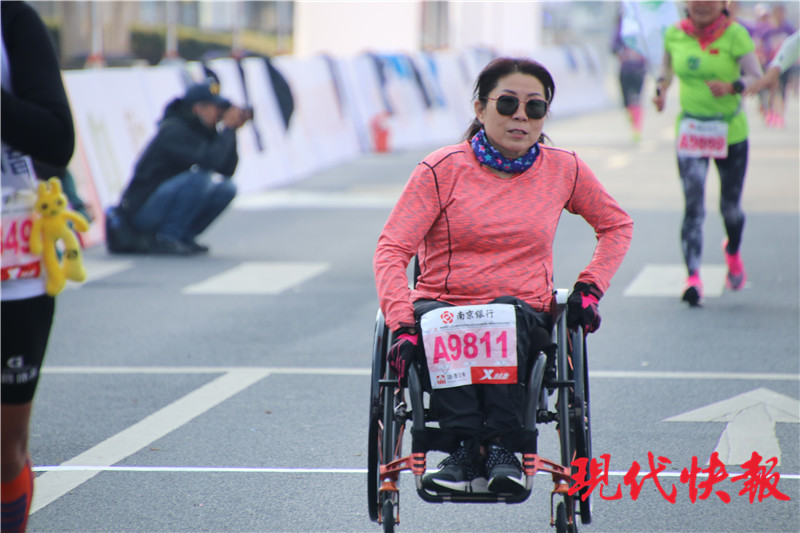 在南馬的賽道上,現(xiàn)代快報記者注意到幾名特殊的選手——“輪椅跑者”。他們用雙手“滾”輪椅,奔跑在賽場上。“這已經(jīng)是我參加的第5個全馬了,賽道少了龍脖子路,好跑多了。”提到跑馬拉松的感受,成玉芬非常激動,她說:“3小時50分可是我第一次參與全馬時的紀錄,后面一直沒有超過,今天我的成績是3小時52分,可惜了,只差兩分鐘,就能突破我的紀錄了。”