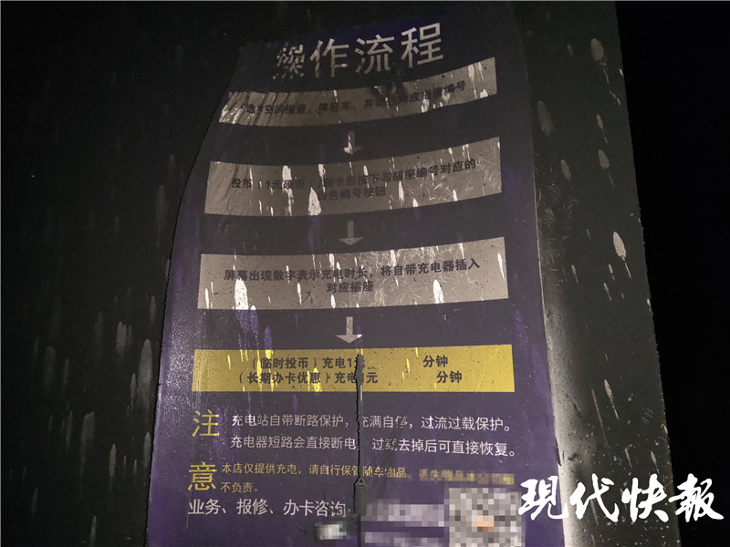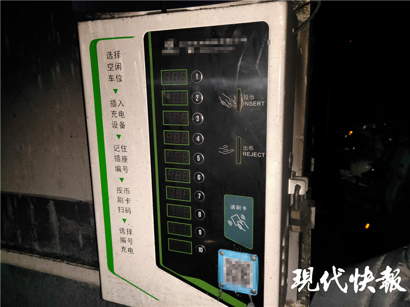 記者在現(xiàn)場注意到,車庫里安裝了一款付費(fèi)式電動(dòng)車充電站。這款充電站與墻壁上的充電插座相連,可供10輛電動(dòng)車同時(shí)充電,它的使用說明中寫道:“充電站自帶斷路保護(hù),充滿自停,過流過載保護(hù)。充電器短路會(huì)自動(dòng)斷電,過載去掉后可直接恢復(fù)。”