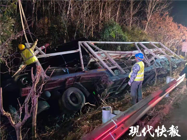 12月9日18時許,接到報警后民警到達事故現(xiàn)場,發(fā)現(xiàn)一輛15米多長的運輸車側翻在護欄外的綠化帶,車頭已經(jīng)凹下去了一半,運輸?shù)?輛林肯SUV已經(jīng)被甩出,損壞嚴重,應急車道邊上的護欄也被撞得脫落,現(xiàn)場一片狼藉。
