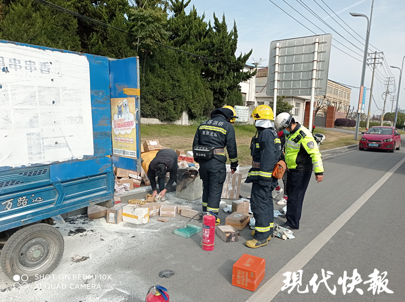 (記者 孫玉春)電動車由于電瓶自燃引發(fā)的火災(zāi)時有發(fā)生,12月15日,南京祿口交警中隊執(zhí)勤警力在巡邏至天祿大道光明乳業(yè)路段時,發(fā)現(xiàn)路邊一輛滿載快遞的電動三輪車發(fā)生自燃。