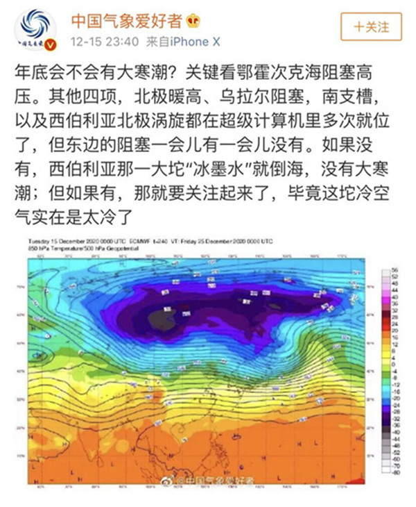 早在12月15日,知名科學(xué)科普博主@中國氣象愛好者就在微博上曬出了一張氣象圖,并配文“年底會(huì)不會(huì)有大寒潮?關(guān)鍵看鄂霍次克海阻塞高壓。其他四項(xiàng),北極暖高、烏拉爾阻塞,南支槽,以及西伯利亞北極渦旋都在超級計(jì)算機(jī)里多次就位了,但東邊的阻塞一會(huì)兒有一會(huì)兒沒有。如果沒有,西伯利亞那一大坨‘冰墨水’就倒海,沒有大寒潮;但如果有,那就要關(guān)注起來了,畢竟這坨冷空氣實(shí)在是太冷了 。”