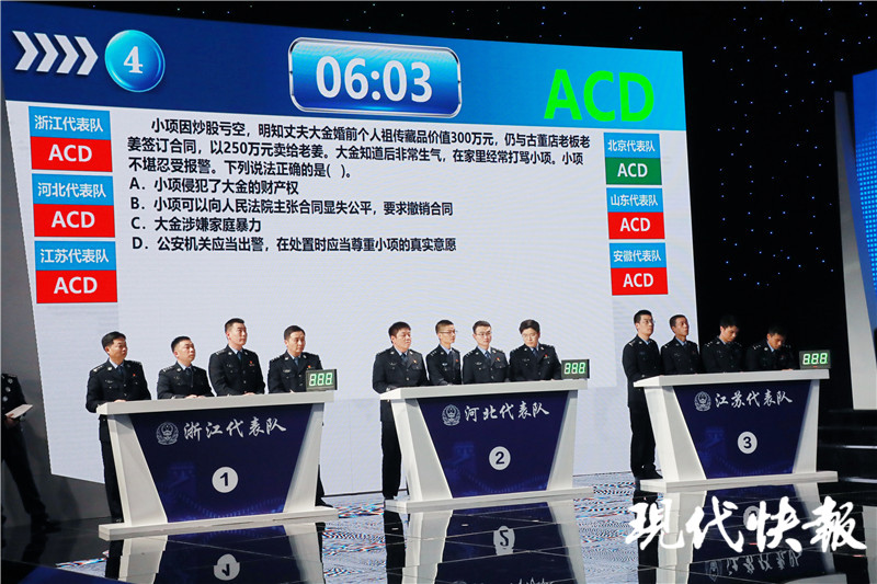 現(xiàn)代快報(bào)記者了解到,通過初賽選拔,全國公安機(jī)關(guān)32支代表隊(duì)成績排名前6的北京、江蘇、河北、安徽、浙江、山東代表隊(duì)進(jìn)入決賽。經(jīng)過決賽的激烈角逐,江蘇代表隊(duì)榮獲一等獎,安徽代表隊(duì)、北京代表隊(duì)榮獲二等獎,山東代表隊(duì)、河北代表隊(duì)、浙江代表隊(duì)榮獲三等獎。同時(shí),評出優(yōu)秀組織獎和優(yōu)秀個(gè)人獎,并頒發(fā)獎匾。