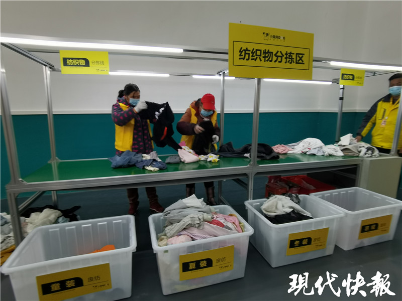 分揀中心每天最高可以分揀處理10 噸可回收物,這些可回收物會通過分揀線進行更細(xì)化的分類。比如,廢紙可以分成黃紙,花紙和書紙三大類。舊衣物在這里分揀后,按品質(zhì)分級分類回收,用新技術(shù)做成手套、環(huán)保袋、保溫棉、路基布、擦機布等。