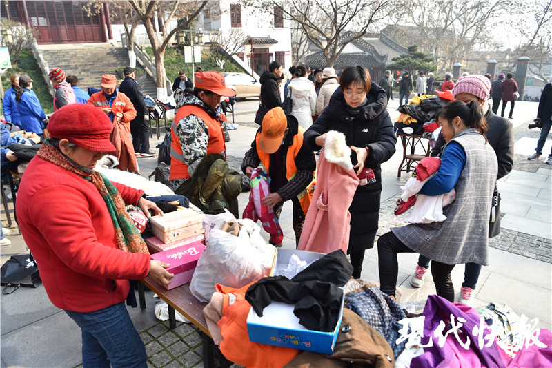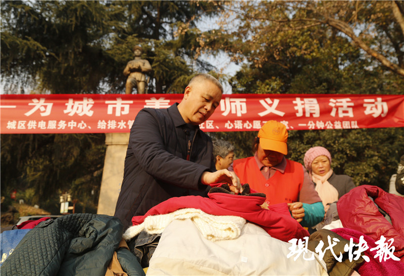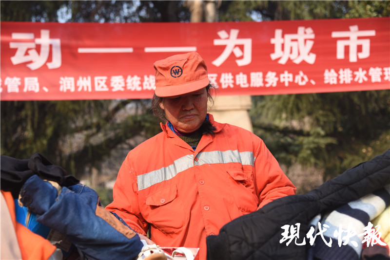 現代快報記者在現場看到,此次活動捐獻的絕大多數為羽絨服、棉襖、大衣以及童裝、童鞋、圍巾等御寒衣物,來自京口、潤州兩區(qū)的一線環(huán)衛(wèi)工人在現場自由挑選。