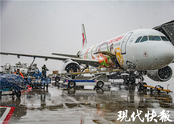 △ 南京機(jī)場工作人員風(fēng)雪中作業(yè)