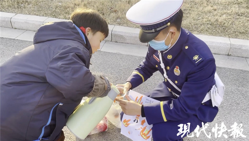 現(xiàn)代快報記者了解到,1月1日下午4點,泰州市海陵區(qū)消防救援大隊門口,一名小學生從電動車后座下來后,飛速跑向門口執(zhí)勤點。