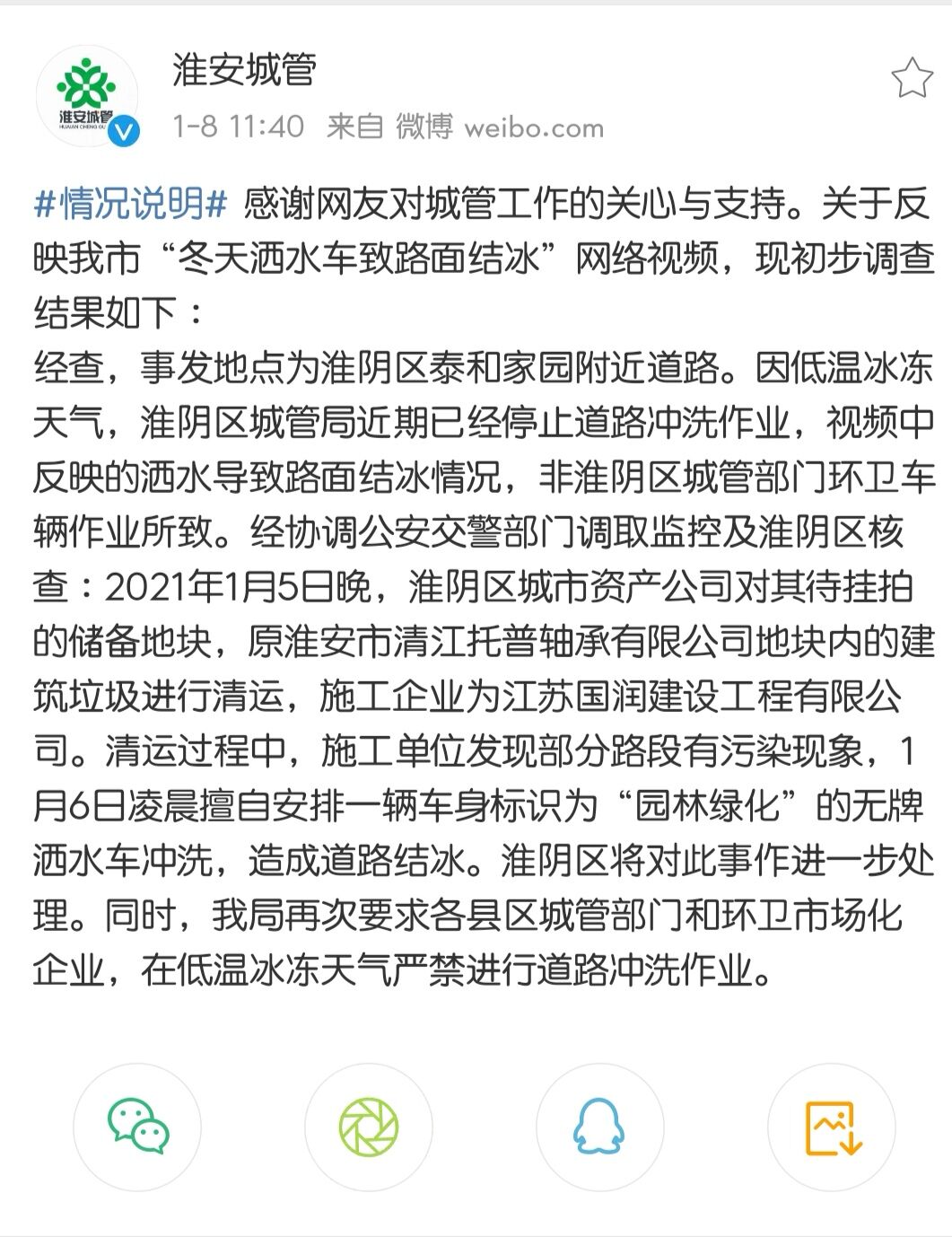 1月8日,淮安市城市管理局在官方微博上發(fā)布情況說明。
