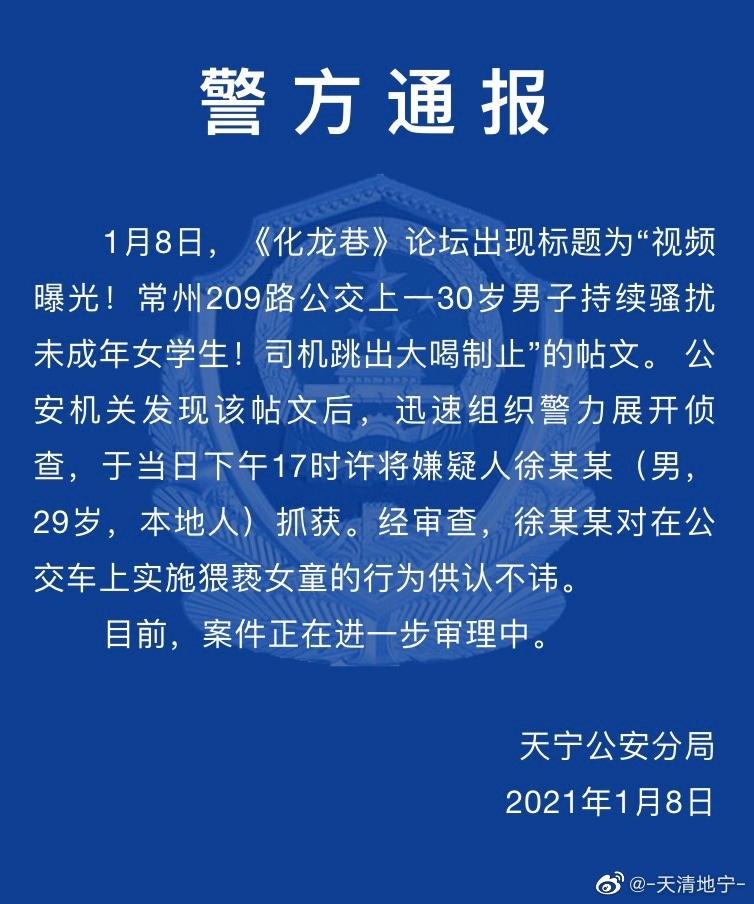 據(jù)通報(bào)稱:1月8日,《化龍巷》 論壇出現(xiàn)標(biāo)題為“視頻曝光!常州209路公交上一30歲男子持續(xù)騷擾未成年女學(xué)生!司機(jī)跳出大喝制止”的帖文。公安機(jī)關(guān)發(fā)現(xiàn)該帖文后,迅速組織警力展開偵查,于當(dāng)日下午17時(shí)許將嫌疑人徐某某(男,29歲,本地人)抓獲。徐某某對(duì)在公交車上實(shí)施猥褻女童的行為供認(rèn)不諱。目前,案件正在進(jìn)一步審理中。