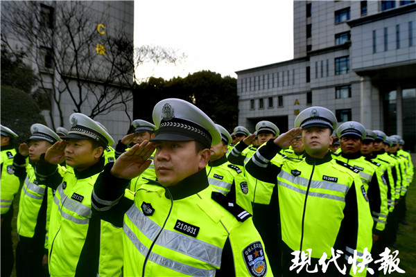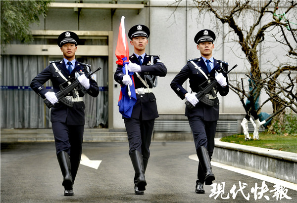 1月10日,室外零下5℃的寒風(fēng)里,來自江蘇省公安廳特勤局的警旗護(hù)衛(wèi)隊(duì)正護(hù)衛(wèi)著人民警察警旗,向公安廳大院的旗桿行進(jìn),中間的擎旗手手擎警旗,兩名護(hù)旗手分列左右,現(xiàn)場(chǎng)觀眾行注目禮。