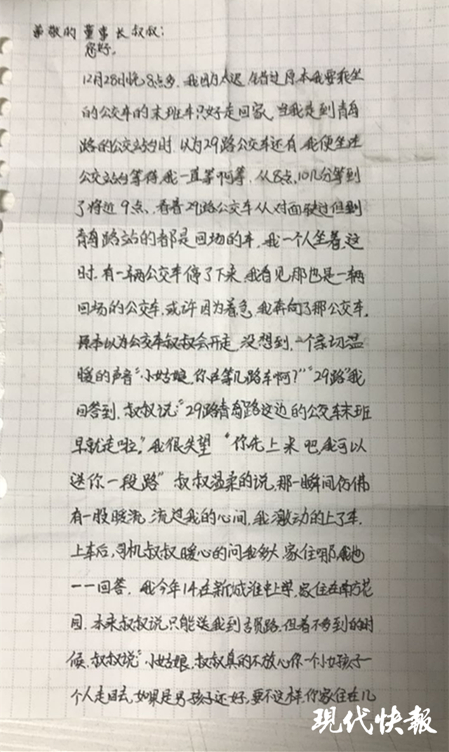 “小姑娘,你在等幾路車啊?”“29路青島路這邊的公交車末班車早就走啦。”“你先上來吧,我可以送你一段路。”“小姑娘,叔叔真的不放心你自己走回去,我把你送回去吧。”……信中,女孩回憶了司機(jī)對她說的每一句話,用真誠質(zhì)樸的語言描述了駕駛員叔叔對自己的關(guān)心,并表示誠摯的感謝。