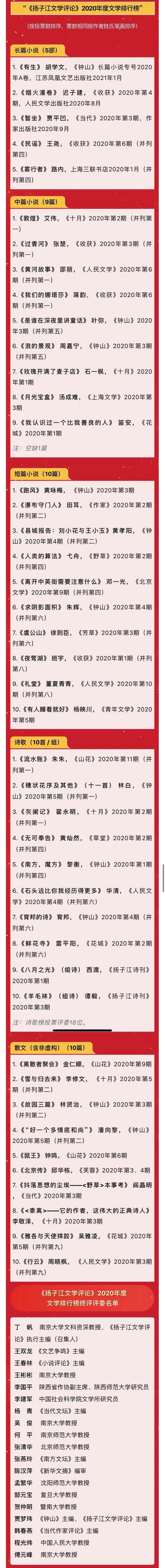 《揚(yáng)子江文學(xué)評(píng)論》年度文學(xué)排行榜創(chuàng)辦于 2017 年,已連續(xù)舉辦四屆,是國(guó)內(nèi)首個(gè)由文學(xué)評(píng)論刊物推出的排行榜,旨在通過評(píng)論家的共識(shí)視野發(fā)現(xiàn)大時(shí)代里具有大格局、大氣象的作品,推動(dòng)當(dāng)代文學(xué)健康繁榮發(fā)展。