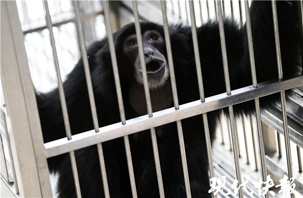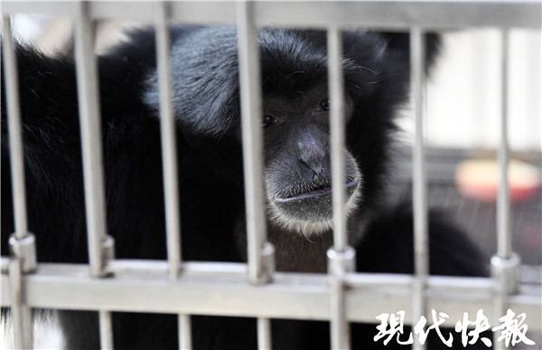 剛到治療室門口,就能聽到合趾猿如低音炮般的啼叫聲,這是媽媽Purba的聲音。經(jīng)過近一個月的修養(yǎng)后,它的身體已逐漸恢復(fù)。走進屋里,只見健壯的Purba,通體黝黑,臉上沒什么毛發(fā),嘴邊略帶一些白毛,正抓著欄桿向著周圍的“不速之客”示威。記者看著眼前有些“兇巴巴”的它,很難想到上個月底,它和腹中的孩子還身處險境。