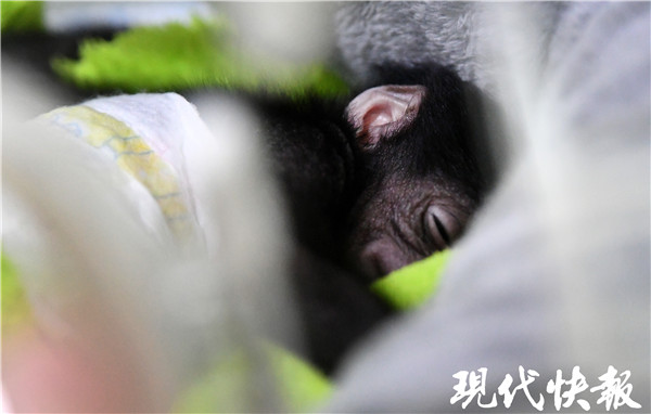 Lucky的媽媽是Purba,爸爸是Bobi,趁著Lucky滿月之際,現(xiàn)代快報記者來到了這對合趾猿母子生活的地方。