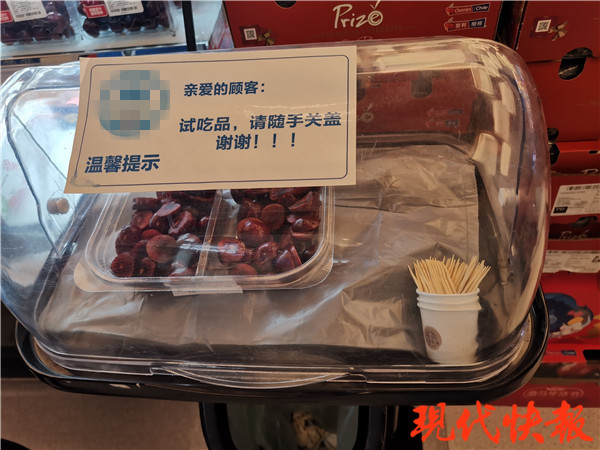 記者注意到,部分車厘子被切成小塊放在盒子內(nèi)里供試吃,路過的市民都戴著口罩,幾乎沒有人品嘗。