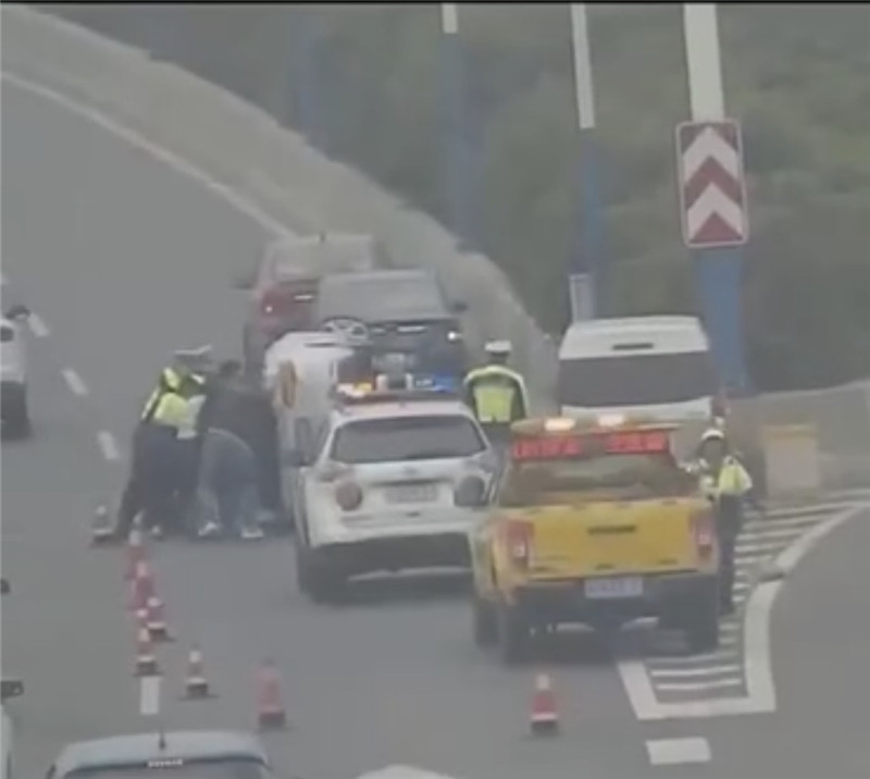 高架上的攝像頭記錄了那一幕:一位中年男士用手肘敲擊車輛右前窗,只見他的“鐵”胳膊猛砸兩次后,車窗玻璃碎了。男子喊另外一男子爬上車,拉開車門,將困在車內(nèi)的女司機(jī)拉起,其他市民也合力幫忙,將女司機(jī)抱出了車。隨后,趕來的幾位警察和熱心市民一起,將側(cè)翻的車輛推正。