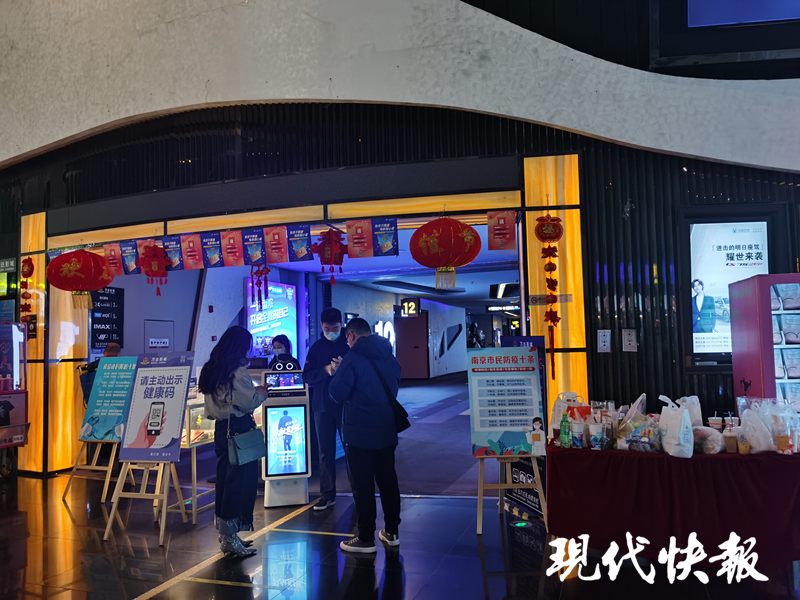 在江寧經(jīng)貿(mào)路中數(shù)影城,影院負責人表示,他們每天每個影廳除了進行五次擦拭外,還有兩次由第三方保潔公司專業(yè)消毒。春節(jié)期間,按照防疫規(guī)定,影廳內(nèi)不能攜帶飲料和食物。在南京萬達江寧影城,記者看到一對情侶在出示健康碼和行程碼,接受體溫檢測后,被工作人員引導將自己攜帶的飲料放在了一張長條桌上,桌上已經(jīng)放滿了觀影者入場前“寄存”的零食和飲料。在新街口國際影城 ,有工作人員舉著“請戴口罩,勿食零食”的牌子在不停巡場。