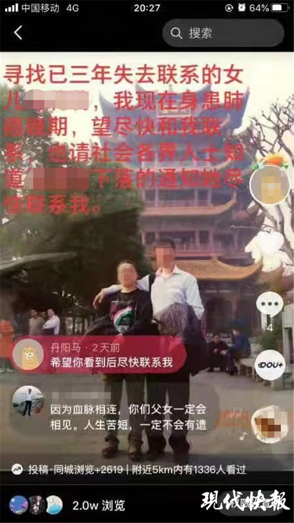 (通訊員 王國禹 虞瑜方 記者 曹德偉)5年前,鎮(zhèn)江丹陽女孩曉麗(化名)負氣離家出走,此后杳無音信。5年后,父親身患癌癥,想在有生之年找到女兒,可卻怎么也聯(lián)系不上。無奈之下,求助到轄區(qū)派出所。民警靈機一動,將父女的合照拍成了短視頻,沒想到經(jīng)過一個多月的傳播,竟真的幫助這對父女團圓了。