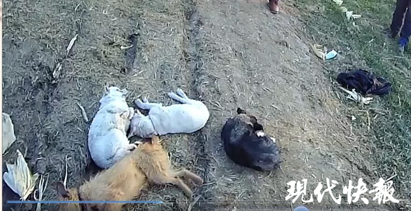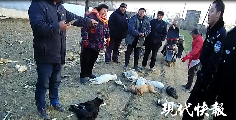 接警后,民警立即趕到現(xiàn)場。不遠處,王某還在慢慢騎著摩托車來回兜圈子。民警上前對王某進行控制,并對摩托車上的物品進行檢查。打開蛇皮口袋后,民警發(fā)現(xiàn)里面有中毒死亡的9條狗,還有一些裹了藥物的雞爪、豬頭肉等食物。