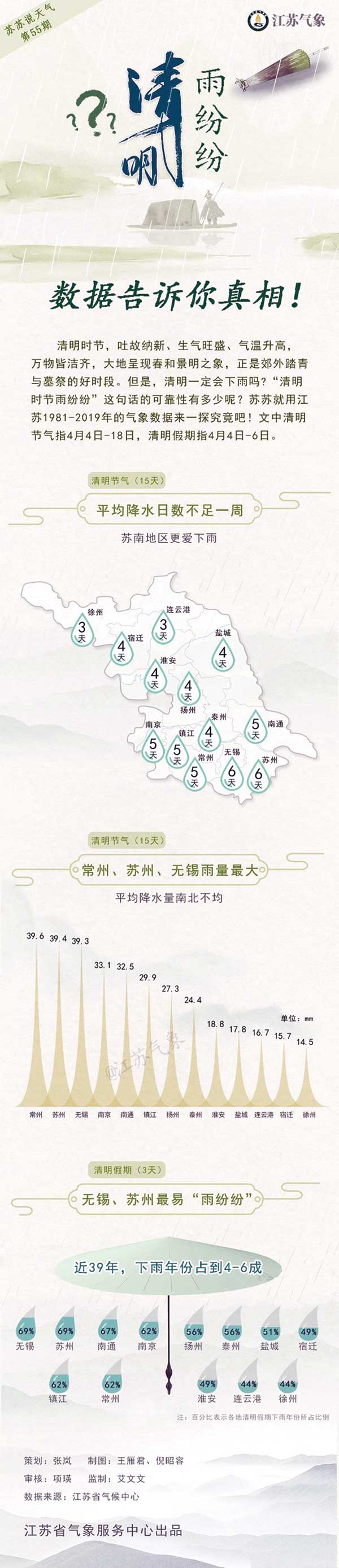 數(shù)據(jù)顯示,清明節(jié)氣期間,平均降水日數(shù)不足一周。相較省內(nèi)其他區(qū)域,蘇南地區(qū)更愛下雨。平均降水日數(shù)在5-6天。降水量分布上也是南北不均,其中,蘇州、常州、無(wú)錫雨量最大。從清明假期來看,近39年統(tǒng)計(jì)數(shù)據(jù)顯示,下雨的年份占到了4-6成,無(wú)錫、蘇州最易“雨紛紛”,這兩個(gè)地方清明假期下雨年份占所有年份的69%,也就是說,近七成的清明假期都是下雨的。