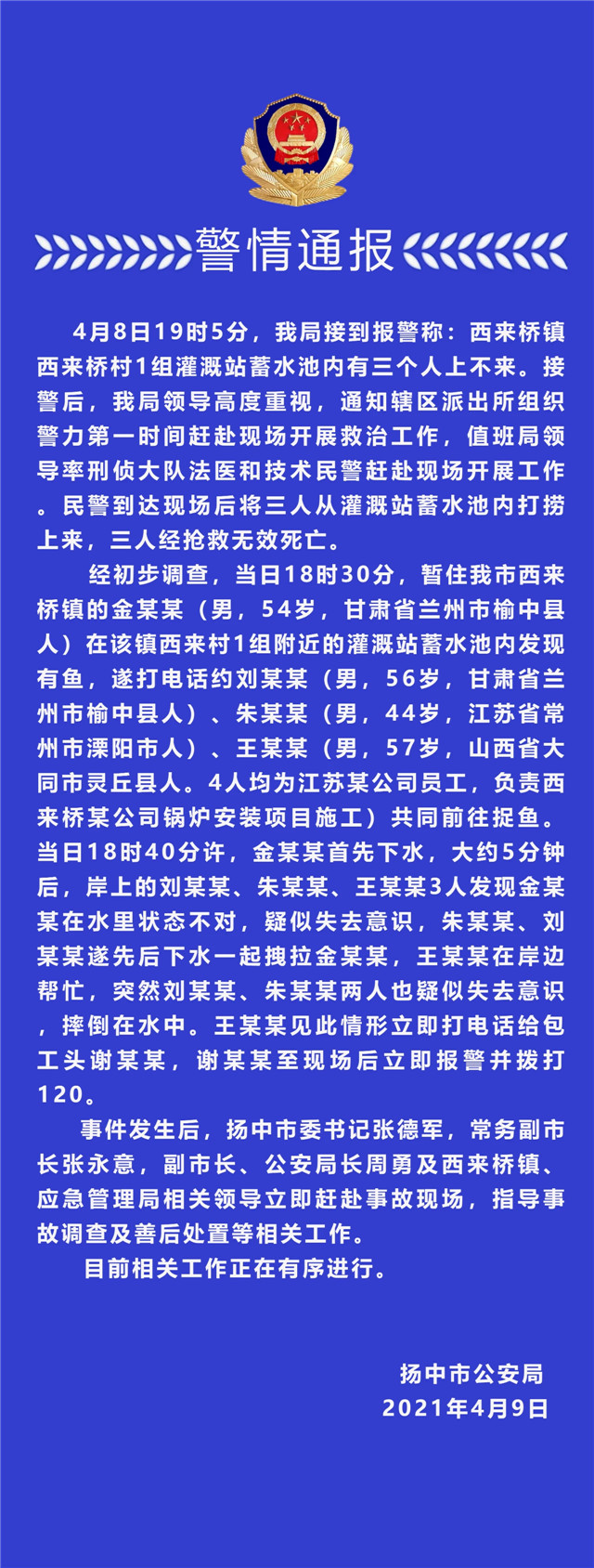警方通報:4月8日19時5分,揚中市公安局接到報警稱西來橋鎮(zhèn)西來橋村1組灌溉站蓄水池內(nèi)有三個人上不來。接警后,揚中市公安局領(lǐng)導(dǎo)高度重視,通知轄區(qū)派出所組織警力第一時間趕赴現(xiàn)場開展救治工作,值班局領(lǐng)導(dǎo)率刑偵大隊法醫(yī)和技術(shù)民警趕赴現(xiàn)場開展工作。民警到達現(xiàn)場后將三人從灌溉站蓄水池內(nèi)打撈上來,三人經(jīng)搶救無效死亡。