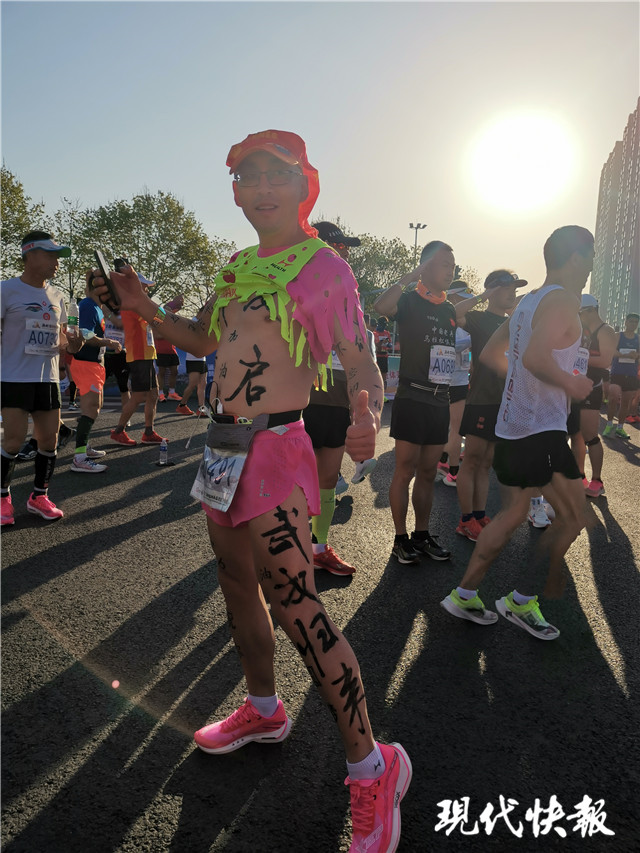 一名渾身寫滿“武漢歸來”“牢記使命”“加油”字樣的男子吸引了不少人的目光。他告訴記者,他已經參加了百余場馬拉松,身上的字是自己彩繪的,這次從武漢來淮安參賽,其中一個原因就是感謝江蘇人對武漢人民的援助。他知道淮安是周恩來總理的故鄉(xiāng),趁著鍛煉身體的好機會,正好領略淮安的美好風光。
