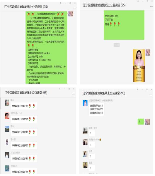 此次課程由婚姻家庭輔導(dǎo)室國家二級心理咨詢師徐燕老師授課,課程一開始就受到了大家的熱烈歡迎。徐老師從婚姻家庭的核心關(guān)系是孩子、父母或伴侶,分享一些典型的小故事,給目前的夫妻關(guān)系的按10分制打分等幾個方面切入,通過與大家語音及互動提問的方式生動形象的講授了婚姻家庭的核心——夫妻關(guān)系,只有在夫妻關(guān)系親密的家庭里,孩子才會體驗(yàn)到更多的歡樂、和諧、信任,而父母才會感到尊重和愛。