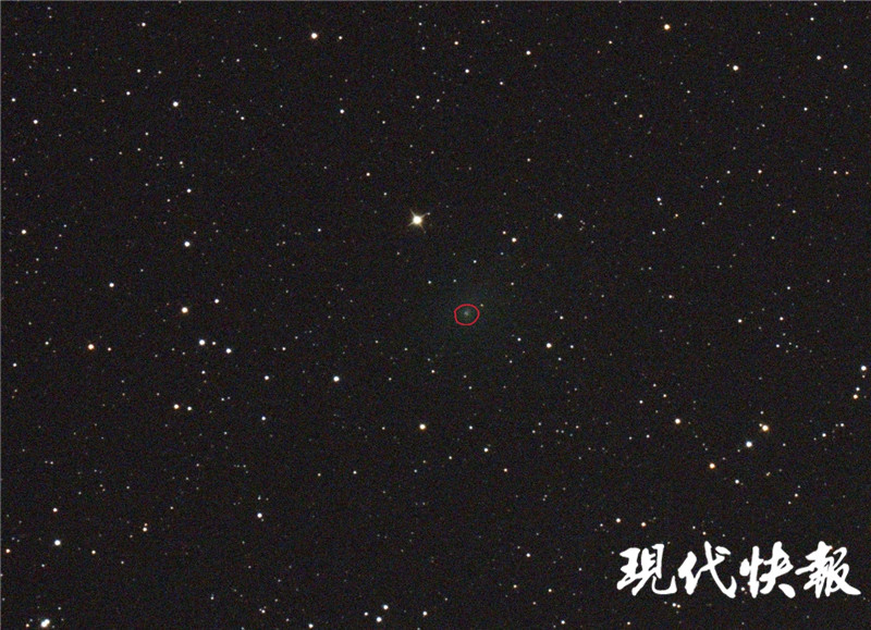 南京天文愛好者協(xié)會(huì)會(huì)員陽垈濤也拍到了這顆彗星。照片中,在其他亮星點(diǎn)綴之下,這顆彗星并不容易一眼被看見。但仔細(xì)一看,又能立刻發(fā)現(xiàn)它的與眾不同:看起來呈彌散狀,比較模糊不清,并發(fā)出淡綠色的光。
