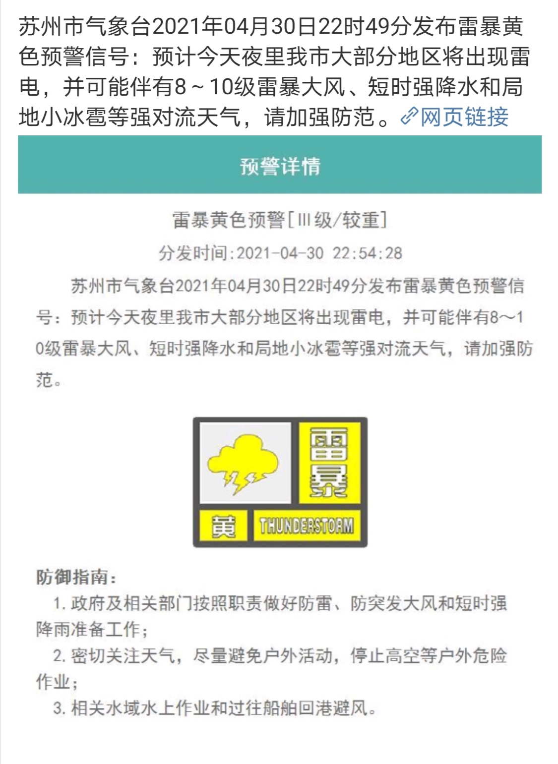 (記者 高達)4月30日22時49分,蘇州市氣象臺發(fā)布雷暴黃色預警稱,預計夜里蘇州大部分地區(qū)將出現(xiàn)雷電,并可能伴有8~10級雷暴大風、短時強降水和局地小冰雹等強對流天氣。
