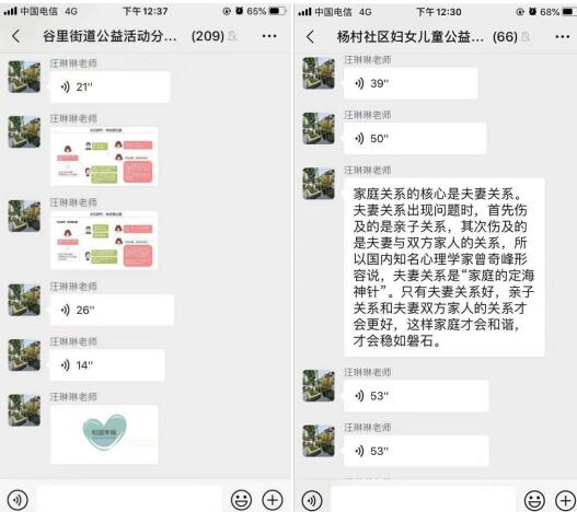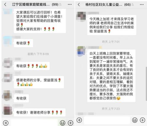 本次課程通過語(yǔ)音、圖片、文章、視頻相結(jié)合的方式在線與大家進(jìn)行講解,著重介紹了夫妻關(guān)系在整個(gè)家庭中的重要性,圍繞如何經(jīng)營(yíng)和諧婚姻關(guān)系、如何處理家庭關(guān)系沖突、建立婚姻心理健康等方面進(jìn)行講解,引導(dǎo)居民正確處理好婚姻、家庭關(guān)系,學(xué)會(huì)在生活中互相信任、理解、包容和尊重對(duì)方。汪老師通過發(fā)生在身邊的案例和大家一一分析矛盾產(chǎn)生原因、解決的辦法以及今后生活中應(yīng)該如何經(jīng)營(yíng)家庭關(guān)系等方面進(jìn)行講解,用通俗易懂的方式幫大家了解婚姻家庭的經(jīng)營(yíng)之道。