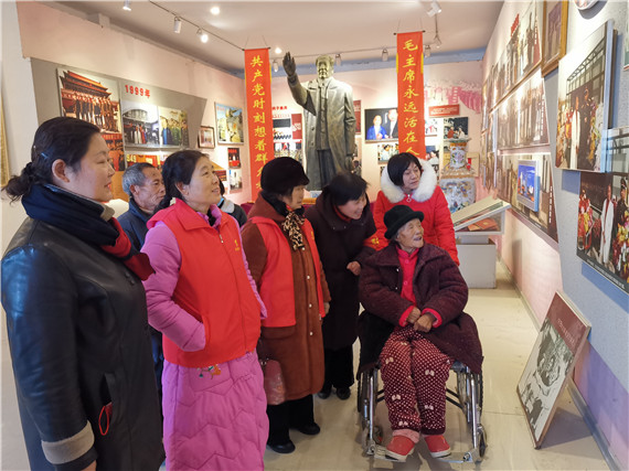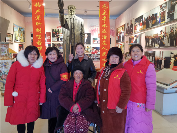 在莊印芳擁軍館,曹愛紅等把燒雞、食品、糕點等慰問品送到莊大媽手里,親切的尋問她的身體及生活情況,向她致以新年的祝福。慰問團成員在擁軍館和莊印芳老人一起向館內(nèi)的毛澤東銅像鞠躬致哀,以表達對偉大領(lǐng)袖毛主席的深切懷念,紀念毛澤東誕辰128周年。隨后慰問團成員還和莊媽媽一起合唱《大海航行靠舵手》,《東方紅》、《歌唱親人解放軍》等革命歌曲,藝術(shù)團成員還參觀了莊印芳擁軍事跡展,一幅幅感人的擁軍事跡照片、一面面各地軍營贈送的錦旗,大家都被莊印芳老人心系國防、擁軍愛軍、無私奉獻的高尚情懷而感動。莊印芳老媽媽也向藝術(shù)團成員回顧了自己從淮海戰(zhàn)役擁軍支前到和平年代幾十年如一日,始終不渝,擁軍愛軍的經(jīng)歷,對藝術(shù)團成員進行擁軍愛軍和雙擁傳統(tǒng)教育,她要求大家要珍惜現(xiàn)在幸福生活,不忘戰(zhàn)爭年代為解放全中國而流血犧牲的革命前輩,不忘偉大領(lǐng)袖毛主席。