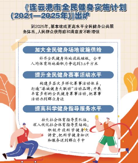 生命在于運動,沒有全民健身就沒有全民健康,沒有全民健康就沒有全面小康。如何將全民健身熱潮進(jìn)一步推向縱深發(fā)展,近期印發(fā)的《連云港市全民健身實施計劃(2021—2025年)》(以下簡稱《實施計劃》)給出了答案。到2025年,連云港市將基本建成更高水平全民健身公共服務(wù)體系,人民群眾獲得感和滿意度不斷增強。