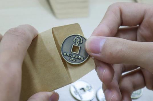 “這枚裝在盲袋里的‘銅錢’,可以制作成精美的掛墜,這份禮物意義十足,它時時提醒我們要學習著名實業(yè)家張謇精神。”今年,揚州大學商學院用盲袋的形式給新生“送錢”,輔導員沈玉琦表示,這份禮物并不是真正意義上的錢,而是造型獨特、內(nèi)涵豐富的商院定制版“銅錢”。